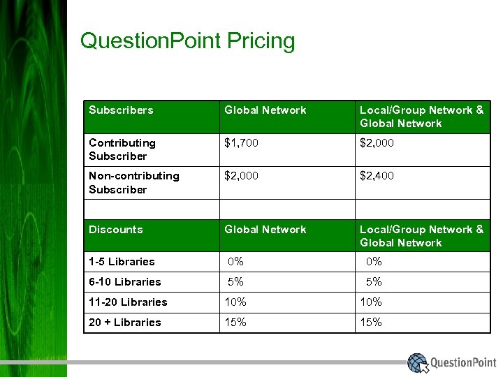 Question. Point Pricing Subscribers Global Network Local/Group Network & Global Network Contributing Subscriber $1, 700 $2, 000 Non-contributing Subscriber $2, 000 $2, 400 Discounts Global Network Local/Group Network & Global Network 1 -5 Libraries 0% 0% 6 -10 Libraries 5% 5% 11 -20 Libraries 10% 20 + Libraries 15%