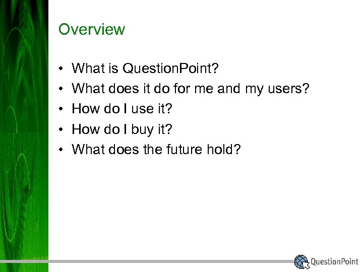 Overview • • • What is Question. Point? What does it do for me and my users? How do I use it? How do I buy it? What does the future hold?