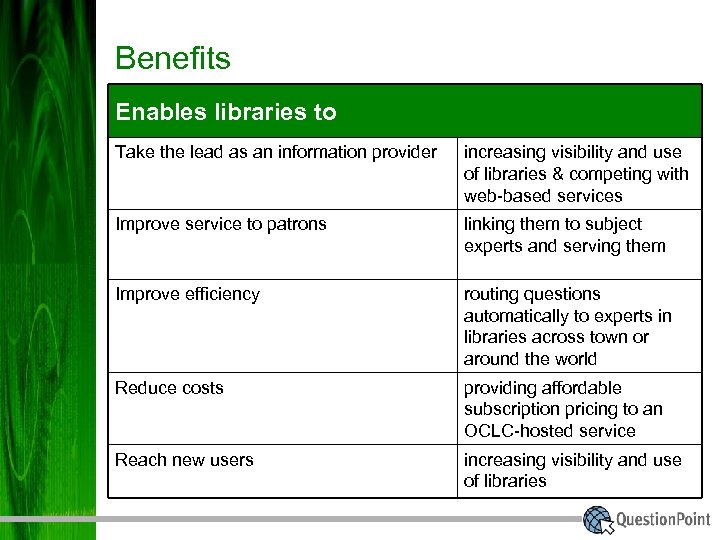 Benefits Enables libraries to Take the lead as an information provider increasing visibility and use of libraries & competing with web-based services Improve service to patrons linking them to subject experts and serving them Improve efficiency routing questions automatically to experts in libraries across town or around the world Reduce costs providing affordable subscription pricing to an OCLC-hosted service Reach new users increasing visibility and use of libraries
