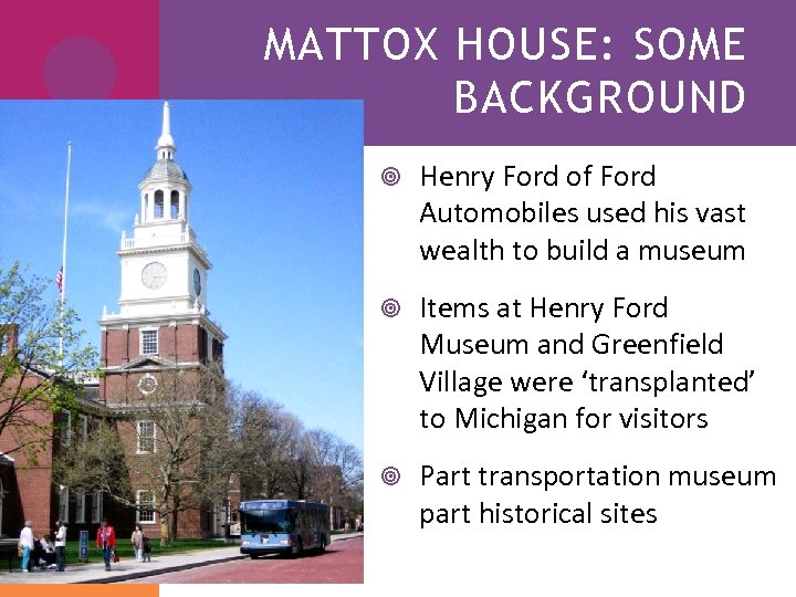 MATTOX HOUSE: SOME BACKGROUND Henry Ford of Ford Automobiles used his vast wealth to build a museum Items at Henry Ford Museum and Greenfield Village were ‘transplanted’ to Michigan for visitors Part transportation museum part historical sites