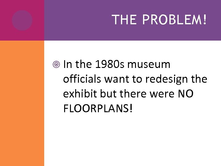 THE PROBLEM! In the 1980 s museum officials want to redesign the exhibit but there were NO FLOORPLANS!
