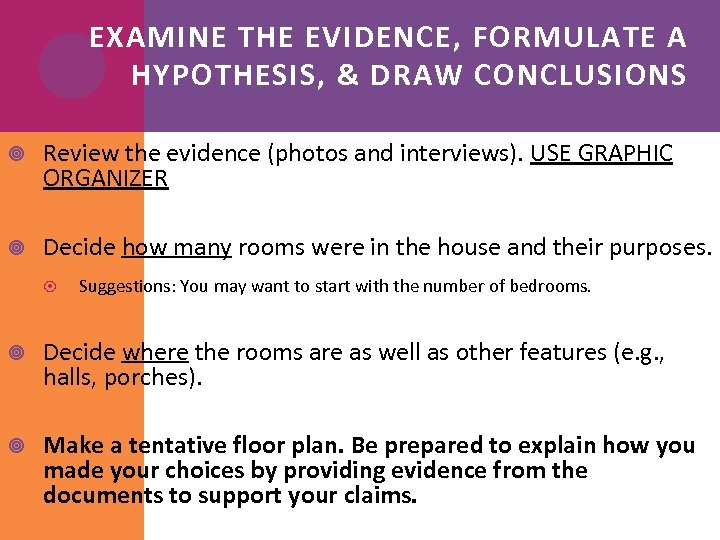EXAMINE THE EVIDENCE, FORMULATE A HYPOTHESIS, & DRAW CONCLUSIONS Review the evidence (photos and interviews). USE GRAPHIC ORGANIZER Decide how many rooms were in the house and their purposes. Suggestions: You may want to start with the number of bedrooms. Decide where the rooms are as well as other features (e. g. , halls, porches). Make a tentative floor plan. Be prepared to explain how you made your choices by providing evidence from the documents to support your claims.