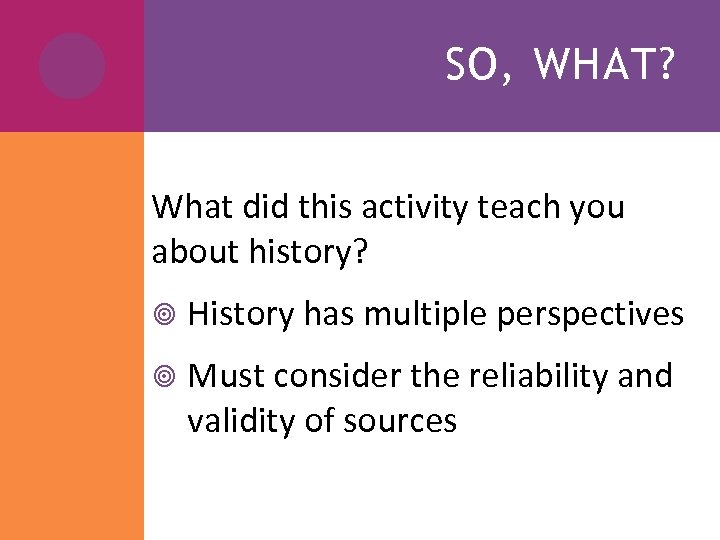 SO, WHAT? What did this activity teach you about history? History has multiple perspectives Must consider the reliability and validity of sources