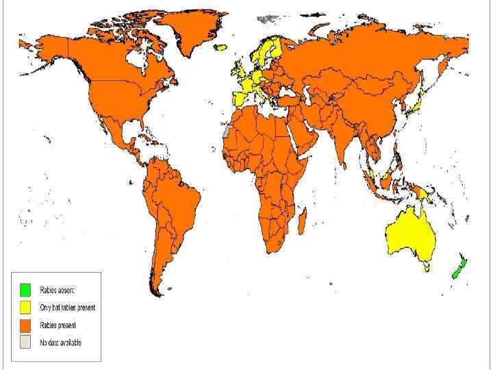 2. Распространение болезни Бешенство имеет место на 5 материках и только Австралия и Новая Зеландия - благополучны по нему. То есть, болезнь имеет глобальный ареал, даже можно говорить о панзоотии бешенства с преимущественным охватом территории Европы и Америки. Панзоотия бешенства характеризуется явным преобладанием бешенства диких животных.