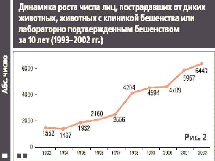 На этом фоне неизменно растет число лиц, пострадавших от животных с установленным клинически или лабораторно диагнозом бешенства (рис. 2). Этот факт вызывает особую озабоченность.