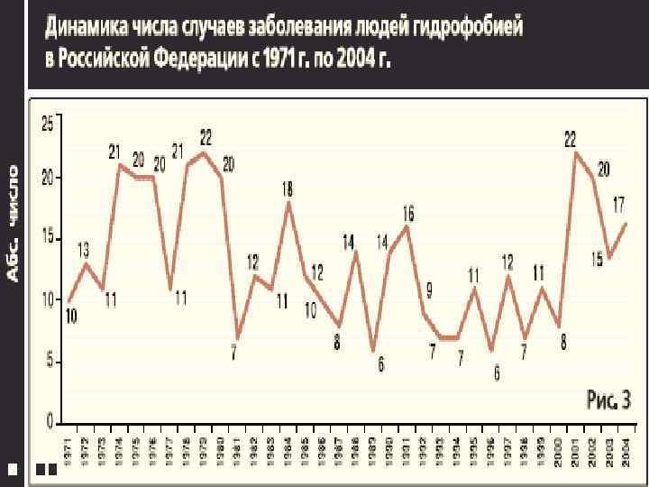 Если на фоне постоянно возрастающего числа лиц, обращающихся за антирабической помощью, динамика летальных случаев гидрофобии в России с 1971 г. по 2000 г. имела выраженную тенденцию к снижению (рис. 3), то после 2001 г. , эта тенденция была нарушена. В 2002 г. зарегистрировано 20 случаев гидрофобии.