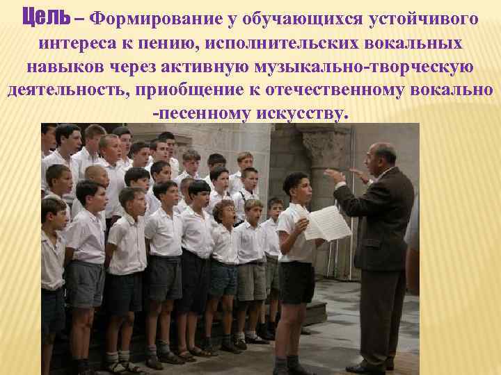 Цель – Формирование у обучающихся устойчивого интереса к пению, исполнительских вокальных навыков через активную музыкально-творческую деятельность, приобщение к отечественному вокально -песенному искусству.