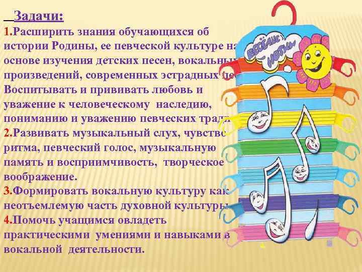 Задачи: 1. Расширить знания обучающихся об истории Родины, ее певческой культуре на основе изучения детских песен, вокальных произведений, современных эстрадных песен. Воспитывать и прививать любовь и уважение к человеческому наследию, пониманию и уважению певческих традиций. 2. Развивать музыкальный слух, чувство ритма, певческий голос, музыкальную память и восприимчивость, творческое воображение. 3. Формировать вокальную культуру как неотъемлемую часть духовной культуры. 4. Помочь учащимся овладеть практическими умениями и навыками в вокальной деятельности.