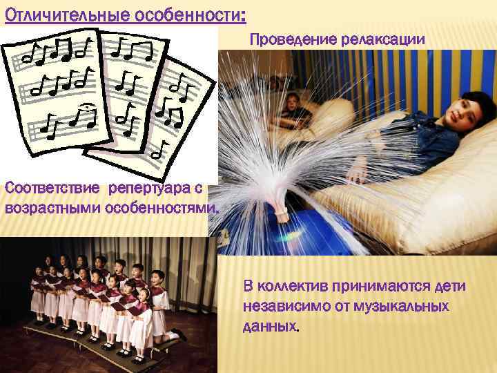 Отличительные особенности: Проведение релаксации Соответствие репертуара с возрастными особенностями. В коллектив принимаются дети независимо от музыкальных данных.