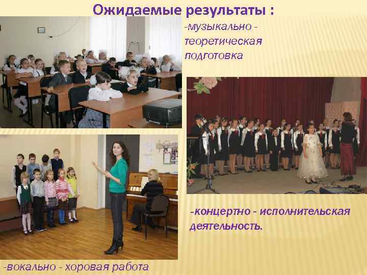Ожидаемые результаты : -музыкально теоретическая подготовка -концертно - исполнительская деятельность. -вокально - хоровая работа