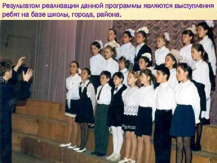 Результатом реализации данной программы являются выступления ребят на базе школы, города, района.