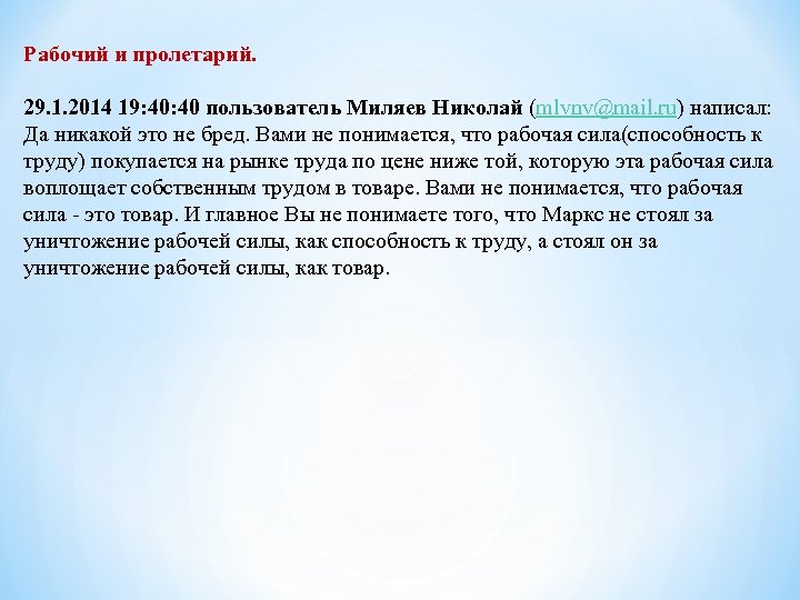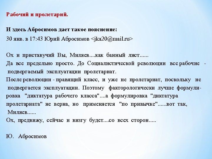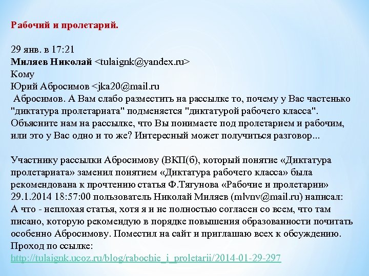 Рабочий и пролетарий. 29 янв. в 17: 21 Миляев Николай <tulaignk@yandex. ru> Кому Юрий Абросимов <jka 20@mail. ru Абросимов. А Вам слабо разместить на рассылке то, почему у Вас частенько "диктатура пролетариата" подменяется "диктатурой рабочего класса". Объясните нам на рассылке, что Вы понимаете под пролетарием и рабочим, или это у Вас одно и то же? Интересный может получиться разговор. . . Участнику рассылки Абросимову (ВКП(б), который понятие «Диктатура пролетариата» заменил понятием «Диктатура рабочего класса» была рекомендована к прочтению статья Ф. Тягунова «Рабочие и пролетарии» 29. 1. 2014 18: 57: 00 пользователь Николай Миляев (mlvnv@mail. ru) написал: А что - неплохая статья, хотя я и не полностью согласен со всем, что там писано, которую рекомендую в порядке повышения образованности почитать особенно Абросимову. Поместил на сайт и приглашаю всех к обсуждению. Проход по ссылке: http: //tulaignk. ucoz. ru/blog/rabochie_i_proletarii/2014 -01 -29 -297