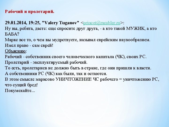 Рабочий и пролетарий. 29. 01. 2014, 19: 25, "Valery Tuganov" <princet@rambler. ru>: Ну вы, ребята, даете: еще спросите друга, - а кто такой МУЖИК, а кто БАБА? Маркс все то, о чем вы мудрствуете, называл еврейским наукообразием. Имел право - сам еврей! Объясняю: Рабочий - собственник своего человеческого капитала (ЧК), своих РС. Пролетарий - эксплуатируемый рабочий. То есть, пролетариев не должно быть в стране, где они пришли к власти. А собственники РС (ЧК) как были, так и остаются. В этом смысле марксово УНИЧТОЖЕНИЕ ЧС рабочего = уничтожению РС, что сущий бред! Покумекайте. . .