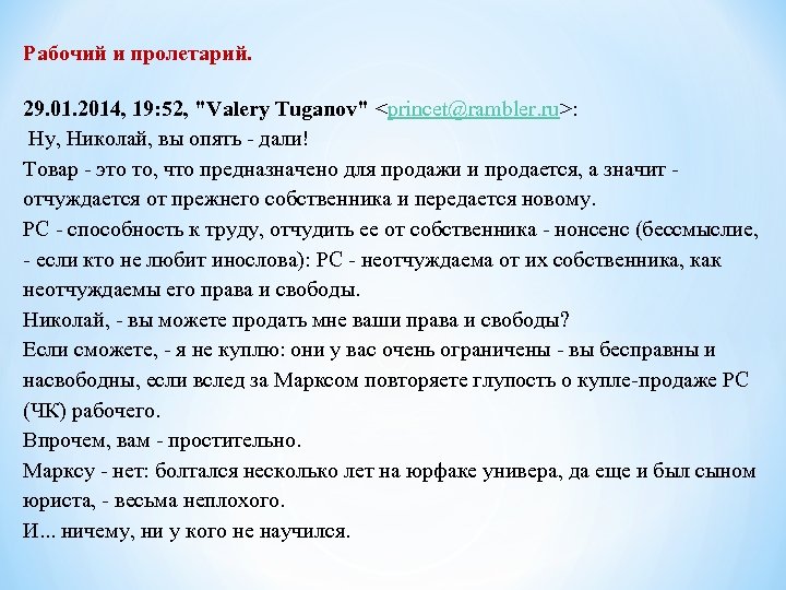 Рабочий и пролетарий. 29. 01. 2014, 19: 52, "Valery Tuganov" <princet@rambler. ru>: Ну, Николай, вы опять - дали! Товар - это то, что предназначено для продажи и продается, а значит - отчуждается от прежнего собственника и передается новому. РС - способность к труду, отчудить ее от собственника - нонсенс (бессмыслие, - если кто не любит инослова): РС - неотчуждаема от их собственника, как неотчуждаемы его права и свободы. Николай, - вы можете продать мне ваши права и свободы? Если сможете, - я не куплю: они у вас очень ограничены - вы бесправны и насвободны, если вслед за Марксом повторяете глупость о купле-продаже РС (ЧК) рабочего. Впрочем, вам - простительно. Марксу - нет: болтался несколько лет на юрфаке универа, да еще и был сыном юриста, - весьма неплохого. И. . . ничему, ни у кого не научился.
