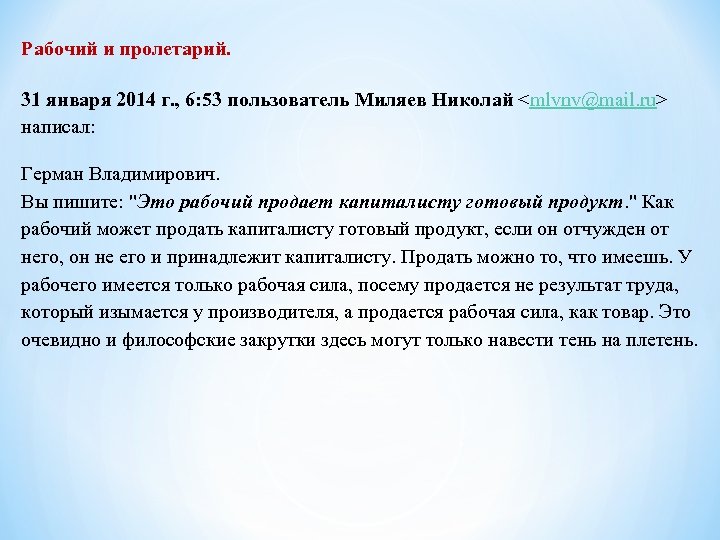 Рабочий и пролетарий. 31 января 2014 г. , 6: 53 пользователь Миляев Николай <mlvnv@mail. ru> написал: Герман Владимирович. Вы пишите: "Это рабочий продает капиталисту готовый продукт. " Как рабочий может продать капиталисту готовый продукт, если он отчужден от него, он не его и принадлежит капиталисту. Продать можно то, что имеешь. У рабочего имеется только рабочая сила, посему продается не результат труда, который изымается у производителя, а продается рабочая сила, как товар. Это очевидно и философские закрутки здесь могут только навести тень на плетень.