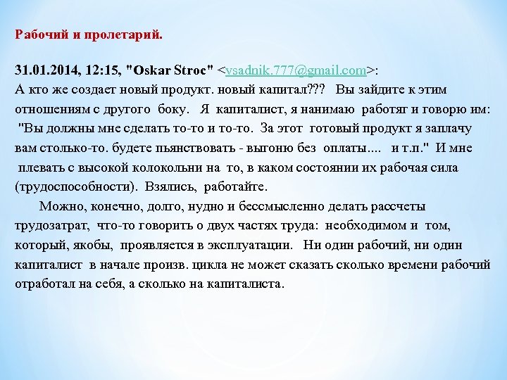 Рабочий и пролетарий. 31 января 2014 г. , 23: 52 пользователь Миляев Николай <mlvnv@mail. ru> написал: Герман Владимирович. И все же я остаюсь при своем мнение, что рабочим продается капиталисту рабочая сила, какие бы там договора не заключали между собой капиталист и рабочий, так как рабочему продавать нечего - он ни чем кроме рабочей силы не обладает ни до производства, ни в процессе производства, ни в стадии распределения. 1 фев. в 2: 57 Oskar Stroc <vsadnik. 777@gmail. com> Ну и оставайтесь ПРИ СВОЕМ!!!! Вы же умнее Маркса! И изучать Вам его нет никакой необходимости! Даже для проверки СВОЕГО ЛИЧНОГО МНЕНИЯ.
