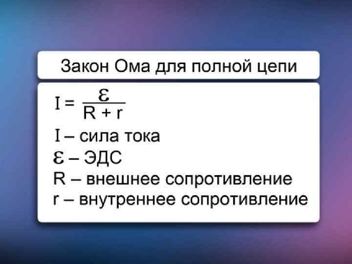 Закон Ома для полной цепи Сила тока равняется отношению ЭДС к сумме полного сопротивления.