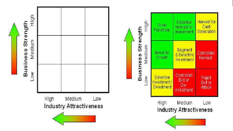 Основные показатели модели чем выше конкурентоспособность товара, и чем выше привлекательность рынка — тем выше потенциал достижения успехов в данном направлении бизнеса чем слабее товар компании относительно конкурентов, чем ниже привлекательность отрасли — тем ниже возможности для роста бизнеса в данном направлении