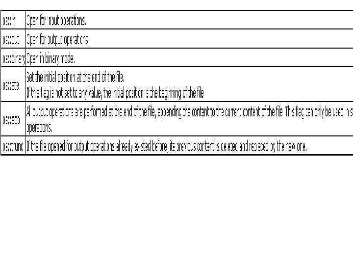• Функция open() классов ofstream, ifstream имеет режим по умолчанию и используется при открытии файла без второго параметра: