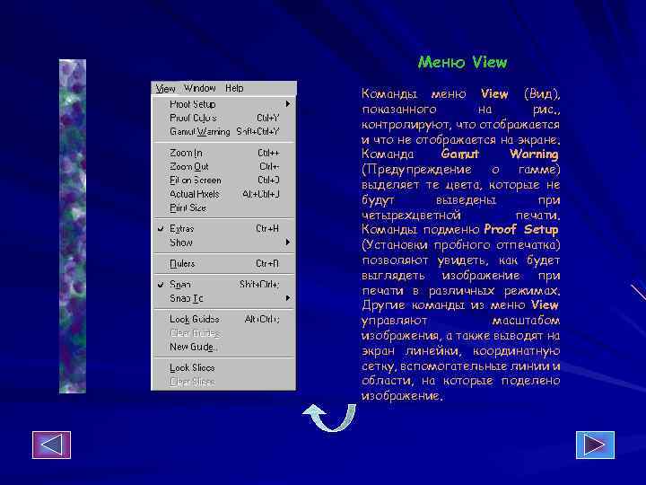 Меню View Команды меню View (Вид), показанного на рис. , контролируют, что отображается и что не отображается на экране. Команда Gamut Warning (Предупреждение о гамме) выделяет те цвета, которые не будут выведены при четырехцветной печати. Команды подменю Proof Setup (Установки пробного отпечатка) позволяют увидеть, как будет выглядеть изображение при печати в различных режимах. Другие команды из меню View управляют масштабом изображения, а также выводят на экран линейки, координатную сетку, вспомогательные линии и области, на которые поделено изображение.