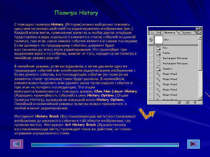 Палитра History С помощью палитры History (История) можно выборочно отменить одно или несколько действий по редактированию изображения (рис. ). Каждый мазок кисти, применение фильтра и любая другая операция представлена в виде отдельного элемента в списке событий на данной палитре, при этом самое нижнее событие является и самым последним. Если щелкнуть по предыдущему событию, документ будет восстановлен до этого этапа редактирования. Что произойдет при выделении какого-то события, зависит от того, находится ли палитра в линейном режиме или нет. В линейном режиме, если вы выделили, а затем удалили одно из предыдущих событий или возобновили редактирование изображения с более раннего события, все последующие события (на палитре их элементы станут тусклыми) также будут удалены. В нелинейном режиме можно выделить или удалить ранее происшедшее событие и при этом не потерять последующие. Эта опция включается/выключается с помощью флажка Allow Non-Linear History (Разрешить нелинейность событий) в окне History Options (Опции палитры History), вызываемом командой меню History Options. Линейный и нелинейный режимы палитры можно переключать в любой момент редактирования. Инструмент History Brush (Восстанавливающая кисть) восстанавливает изображение до указанного события в той области изображения, где провели кистью. Инструмент Art History Brush (Художественная восстанавливающая кисть) производит такое же действие, но только штрихами определенного стиля.