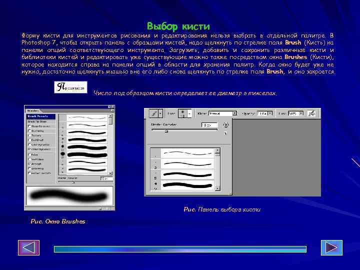 Рис. Штрихи, созданные с помощью инструмента Brush при использовании различных кистей Наряду с другими возможностями палитра кистей позволяет выполнить предварительный просмотр кисти по миниатюре ее следа. Рис. Окно выбора кисти
