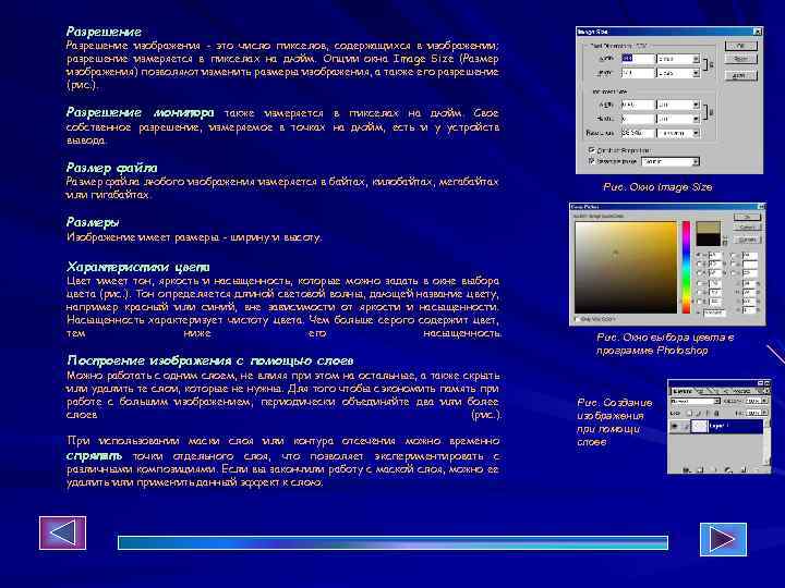 Разрешение изображения - это число пикселов, содержащихся в изображении; разрешение измеряется в пикселах на дюйм. Опции окна Image Size (Размер изображения) позволяют изменить размеры изображения, а также его разрешение (рис. ). Разрешение монитора также измеряется в пикселах на дюйм. Свое собственное разрешение, измеряемое в точках на дюйм, есть и у устройств вывода. Размер файла любого изображения измеряется в байтах, килобайтах, мегабайтах или гигабайтах. Рис. Окно Image Size Размеры Изображение имеет размеры - ширину и высоту. Характеристики цвета Цвет имеет тон, яркость и насыщенность, которые можно задать в окне выбора цвета (рис. ). Тон определяется длиной световой волны, дающей название цвету, например красный или синий, вне зависимости от яркости и насыщенности. Насыщенность характеризует чистоту цвета. Чем больше серого содержит цвет, тем ниже его насыщенность. Построение изображения с помощью слоев Можно работать с одним слоем, не влияя при этом на остальные, а также скрыть или удалить те слои, которые не нужны. Для того чтобы сэкономить память при работе с большим изображением, периодически объединяйте два или более слоев (рис. ). При использовании маски слоя или контура отсечения можно временно спрятать точки отдельного слоя, что позволяет экспериментировать с различными композициями. Если вы закончили работу с маской слоя, можно ее удалить или применить данный эффект к слою. Рис. Окно выбора цвета в программе Photoshop Рис. Создание изображения при помощи слоев