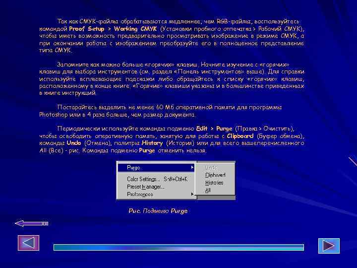 Так как CMYK-файлы обрабатываются медленнее, чем RGB-файлы, воспользуйтесь командой Proof Setup > Working CMYK (Установки пробного отпечатка > Рабочий CMYK), чтобы иметь возможность предварительно просматривать изображение в режиме CMYK, а при окончании работы с изображением преобразуйте его в полноценное представление типа CMYK. Запомните как можно больше «горячих» клавиш. Начните изучение с «горячих» клавиш для выбора инструментов (см. раздел «Панель инструментов» выше). Для справки используйте всплывающие подсказки либо обращайтесь к списку «горячих» клавиш, расположенному в конце книге. «Горячие» клавиши указаны и в большинстве приведенных в книге инструкций. Постарайтесь выделить не менее 60 Мб оперативной памяти для программы Photoshop или в 4 раза больше, чем размер документа. Периодически используйте команды подменю Edit > Purge (Правка > Очистить), чтобы освободить оперативную память, занятую для работы с Clipboard (Буфер обмена), команды Undo (Отмена), палитры History (История) или для всего вышеперечисленного All (Все) - рис. Команды подменю Purge отменить нельзя. Рис. Подменю Purge