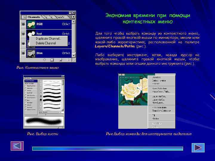 Экономия времени при помощи контекстных меню Для того чтобы выбрать команду из контекстного меню, щелкните правой кнопкой мыши по миниатюре, имени или какой-либо характеристике, расположенной на палитре Layers/Channels/Paths (рис. ). Либо выберите инструмент, затем, наведя курсор на изображение, щелкните правой кнопкой мыши, чтобы выбрать команды или опции данного инструмента (рис. ). Рис. Контекстное меню Рис. Выбор кисти Рис. Выбор команды для инструмента выделения