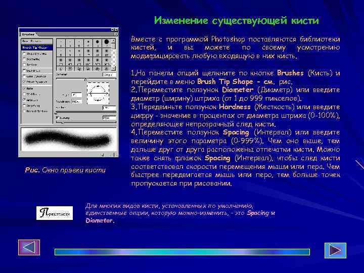 Изменение существующей кисти Вместе с программой Photoshop поставляются библиотеки кистей, и вы можете по своему усмотрению модифицировать любую входящую в них кисть. Рис. Окно правки кисти 1. На панели опций щелкните по кнопке Brushes (Кисть) и перейдите в меню Brush Tip Shape - см. рис. 2. Переместите ползунок Diameter (Диаметр) или введите диаметр (ширину) штриха (от 1 до 999 пикселов). 3. Передвиньте ползунок Hardness (Жесткость) или введите цифру - значение в процентах от диаметра штриха (0 -100%), определяющее непрозрачный след кисти. 4. Переместите ползунок Spacing (Интервал) или введите величину этого параметра (0 -999%). Чем оно выше, тем дальше друг от друга расположены отпечатки кисти. Можно также снять флажок Spacing (Интервал), чтобы след кисти соответствовал скорости перемещения мыши или пера. Чем быстрее передвигается мышь или перо, тем больше точек пропускается при рисовании. Для многих видов кисти, установленных по умолчанию, единственные опции, которую можно-изменить, - это Spacing и Diameter.