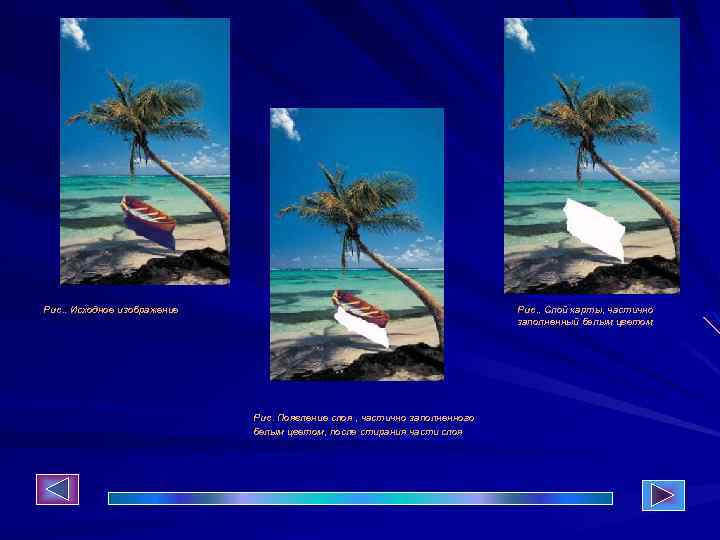 Рис. . Исходное изображение Рис. . Слой карты, частично заполненный белым цветом Рис. Появление слоя , частично заполненного белым цветом, после стирания части слоя