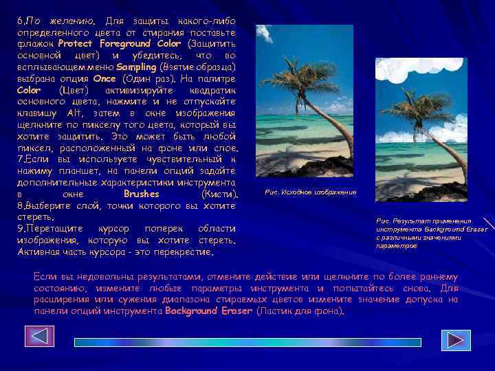6. По желанию. Для защиты какого-либо определенного цвета от стирания поставьте флажок Protect Foreground Color (Защитить основной цвет) и убедитесь, что во всплывающем меню Sampling (Взятие образца) выбрана опция Once (Один раз). На палитре Color (Цвет) активизируйте квадратик основного цвета, нажмите и не отпускайте клавишу Alt, затем в окне изображения щелкните по пикселу того цвета, который вы хотите защитить. Это может быть любой пиксел, расположенный на фоне или слое. 7. Если вы используете чувствительный к нажиму планшет, на панели опций задайте дополнительные характеристики инструмента в окне Brushes (Кисти). 8. Выберите слой, точки которого вы хотите стереть. 9. Перетащите курсор поперек области изображения, которую вы хотите стереть. Активная часть курсора - это перекрестие. Рис. Исходное изображение Рис. Результат применения инструмента Background Eraser с различными значениями параметров Если вы недовольны результатами, отмените действие или щелкните по более раннему состоянию, измените любые параметры инструмента и попытайтесь снова. Для расширения или сужения диапазона стираемых цветов измените значение допуска на панели опций инструмента Background Eraser (Ластик для фона).