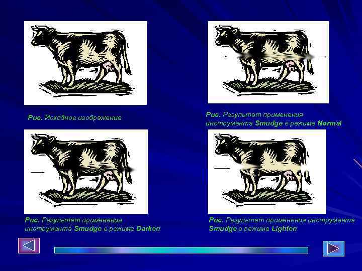 Рис. Исходное изображение Рис. Результат применения инструмента Smudge в режиме Darken Рис. Результат применения инструмента Smudge в режиме Normal Рис. Результат применения инструмента Smudge в режиме Lighten