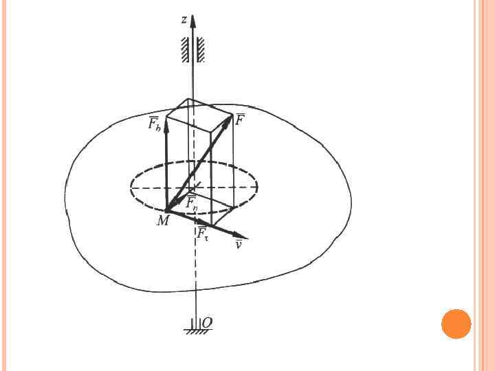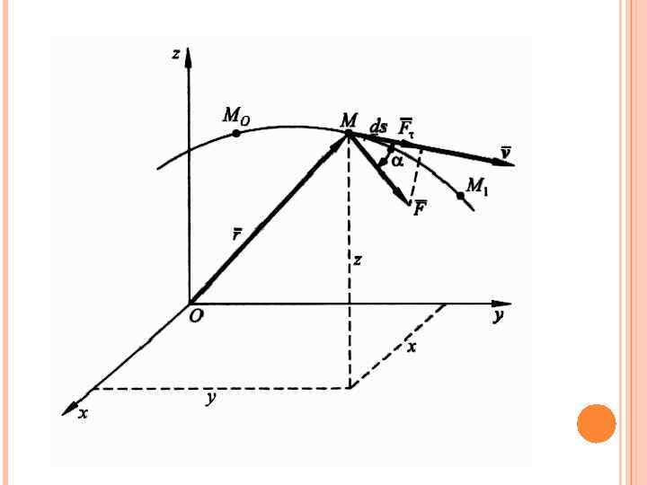 РАБОТА СИЛЫ ПРИ ВРАЩЕНИИ ТВЕРДОГО ТЕЛА ВОКРУГ НЕПОДВИЖНОЙ ОСИ. Разложим силу , приложенную в произвольной точке М тела, по осям естественного трехгранника Работы составляющих силы по нормали и бинормали равны нулю, ибо они направлены всегда перпендикулярно к вектору скорости точки М.