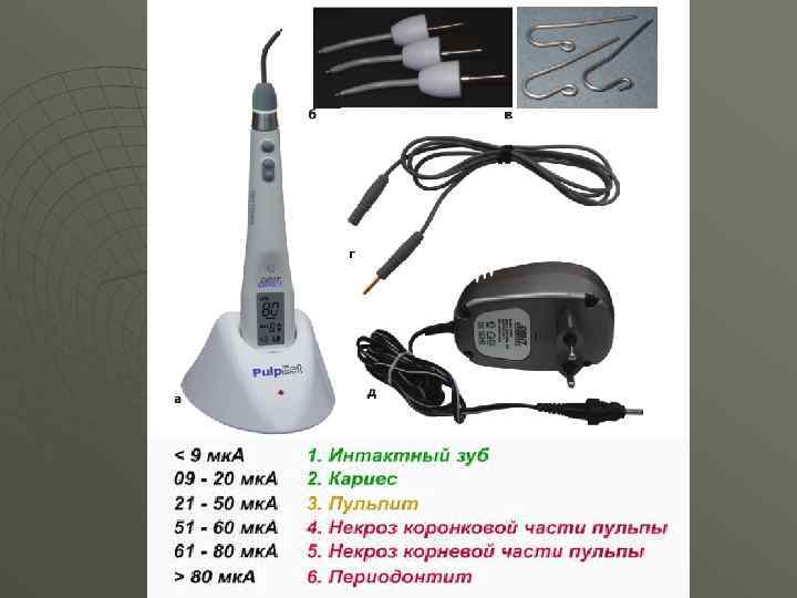 u u Метод оценки возбудимости чувствительных нервов зуба при их раздражении электрическим током. Основан на определении минимальной (пороговой) силы раздражающего тока (в пределах до 100 мк. А), вызывающей болевую реакцию. Осуществляют с помощью электроодонтометра и пары электродов, один из которых (пассивный) пациент держит рукой, другим (активным), выполненным в виде стоматологического зонда, прикасаются к поверхности коронки зуба. Используют для диагностики витальности пульпы зуба и дифференциальной диагностики кариеса, пульпита, периодонтита.