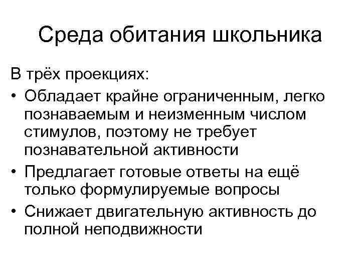Среда обитания школьника В трёх проекциях: • Обладает крайне ограниченным, легко познаваемым и неизменным числом стимулов, поэтому не требует познавательной активности • Предлагает готовые ответы на ещё только формулируемые вопросы • Снижает двигательную активность до полной неподвижности