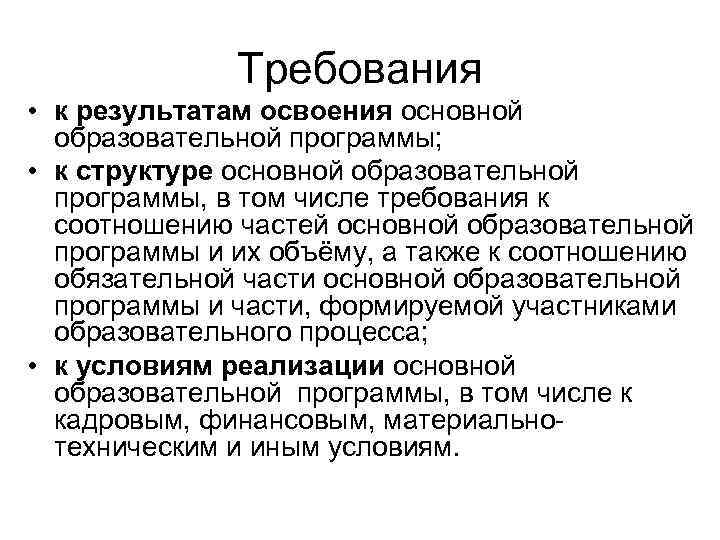 Требования • к результатам освоения основной образовательной программы; • к структуре основной образовательной программы, в том числе требования к соотношению частей основной образовательной программы и их объёму, а также к соотношению обязательной части основной образовательной программы и части, формируемой участниками образовательного процесса; • к условиям реализации основной образовательной программы, в том числе к кадровым, финансовым, материально техническим и иным условиям.