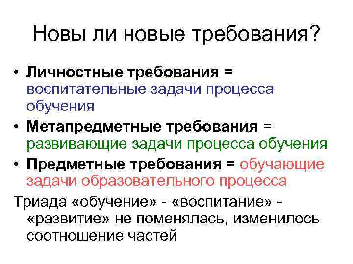 Новы ли новые требования? • Личностные требования = воспитательные задачи процесса обучения • Метапредметные требования = развивающие задачи процесса обучения • Предметные требования = обучающие задачи образовательного процесса Триада «обучение» «воспитание» «развитие» не поменялась, изменилось соотношение частей