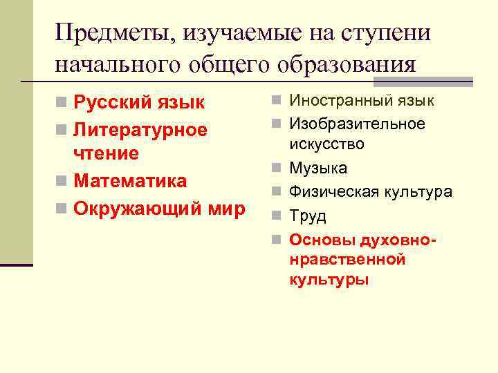 Предметы, изучаемые на ступени начального общего образования n Русский язык n Иностранный язык n Литературное n Изобразительное чтение n Математика n Окружающий мир n n искусство Музыка Физическая культура Труд Основы духовно нравственной культуры