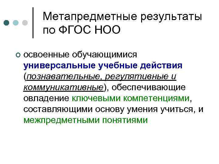 Метапредметные результаты по ФГОС НОО ¢ освоенные обучающимися универсальные учебные действия (познавательные, регулятивные и коммуникативные), обеспечивающие овладение ключевыми компетенциями, составляющими основу умения учиться, и межпредметными понятиями