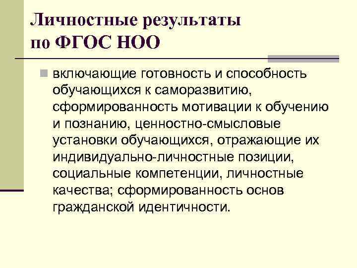 Личностные результаты по ФГОС НОО n включающие готовность и способность обучающихся к саморазвитию, сформированность мотивации к обучению и познанию, ценностно смысловые установки обучающихся, отражающие их индивидуально личностные позиции, социальные компетенции, личностные качества; сформированность основ гражданской идентичности.