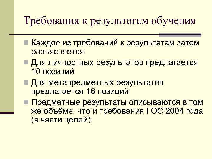 Требования к результатам обучения n Каждое из требований к результатам затем разъясняется. n Для личностных результатов предлагается 10 позиций n Для метапредметных результатов предлагается 16 позиций n Предметные результаты описываются в том же объёме, что и требования ГОС 2004 года (в части целей).