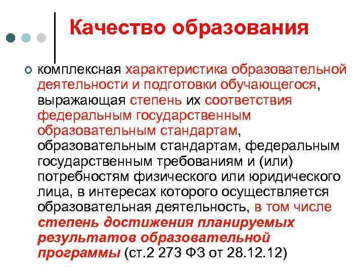 Качество образования ¢ комплексная характеристика образовательной деятельности и подготовки обучающегося, выражающая степень их соответствия федеральным государственным образовательным стандартам, федеральным государственным требованиям и (или) потребностям физического или юридического лица, в интересах которого осуществляется образовательная деятельность, в том числе степень достижения планируемых результатов образовательной программы (ст. 2 273 ФЗ от 28. 12)