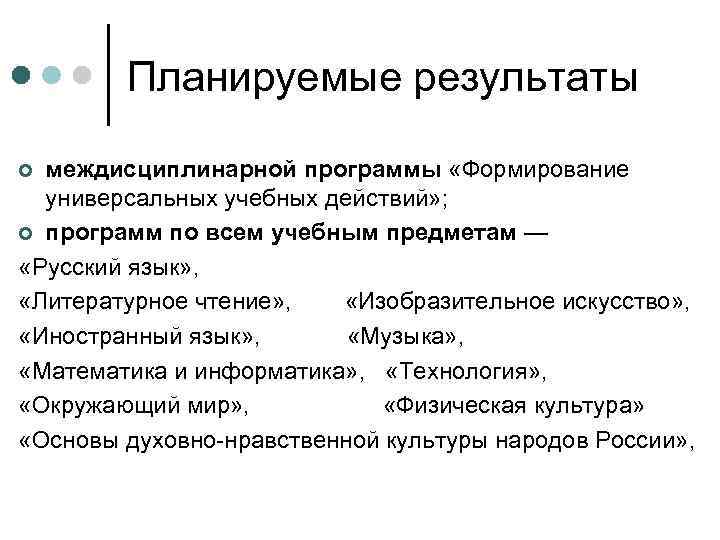Планируемые результаты междисциплинарной программы «Формирование универсальных учебных действий» ; ¢ программ по всем учебным предметам — «Русский язык» , «Литературное чтение» , «Изобразительное искусство» , «Иностранный язык» , «Музыка» , «Математика и информатика» , «Технология» , «Окружающий мир» , «Физическая культура» «Основы духовно нравственной культуры народов России» , ¢