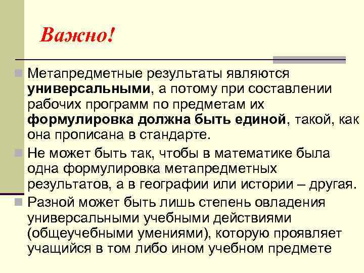 Важно! n Метапредметные результаты являются универсальными, а потому при составлении рабочих программ по предметам их формулировка должна быть единой, такой, как она прописана в стандарте. n Не может быть так, чтобы в математике была одна формулировка метапредметных результатов, а в географии или истории – другая. n Разной может быть лишь степень овладения универсальными учебными действиями (общеучебными умениями), которую проявляет учащийся в том либо ином учебном предмете