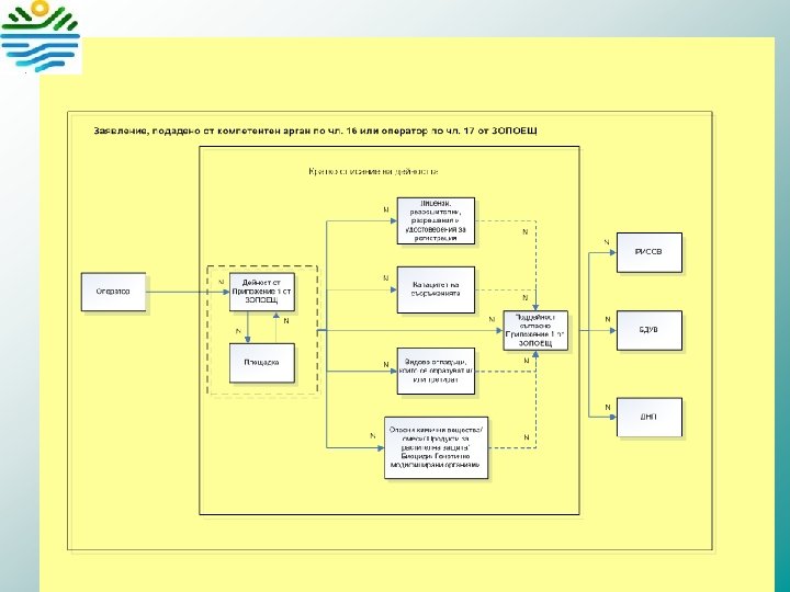 • 1. Дейностите в приложното поле на ЗОПОЕЩ: Експлоатация на инсталации и съоръжения, за които се изисква издаване на комплексно разрешително по чл. 117 от Закона за опазване на околната среда, с изключение на инсталациите и съоръженията или частите от тях, използвани за изследователска работа, разработки и изпитания на нови продукти и процеси. 2. За дейности по събиране, транспортиране, оползотворяване или обезвреждане на отпадъци, в т. ч. опасни отпадъци, за които се изисква разрешение или регистрационен документ съгласно Закона за управление на отпадъците. 3. Извършване на дейности по използване на водите и водните обекти, за които се изисква издаване на разрешително по смисъла на Закона за водите. 4. Извършване на дейности по производство, употреба, съхранение, обработка, пълнене и изпускане в околната среда на химични вещества по смисъла на чл. 2 от Закона за защита от вредното въздействие на химичните вещества и смеси. 5. Извършване на дейности по производство, употреба, съхранение, обработка, пълнене и изпускане в околната среда на продукти за растителна защита по смисъла на Закона за защита на растенията. 6. Извършване на дейности по производство, употреба, съхранение, обработка, пълнене и изпускане в околната среда на биоциди по смисъла на Закона за защита от вредното въздействие на химичните вещества и смеси. 7. Извършване на дейности по превоз на опасни товари по смисъла на Закона за автомобилните превози, Закона за железопътния транспорт, Закона за морските пространства, вътрешните водни пътища и пристанищата на Република България и Закона за гражданското въздухоплаване. 8. Извършване на дейности по работа с генетично модифицирани организми (ГМО) в контролирани условия, освобождаване на ГМО в околната среда, пускане на пазара на ГМО или комбинация от тях като продукти или съставка на продукти, пренасяне на ГМО, внос, износ и транзит на ГМО по смисъла на Закона за генетично модифицирани организми, за които дейности се изисква разрешение в съответствие със Закона за генетично модифицирани организми. 9. Извършване на дейности по внасяне, изнасяне и транзит на отпадъци по смисъла на глава пета, раздел IV от Закона за управление на отпадъците, за които се изисква разрешение или регистрация. 10. Извършване на дейности по управление на минните отпадъци. 11. Експлоатация на места за съхранение в съответствие със Закона за съхранение на въглероден диоксид в земните недра.