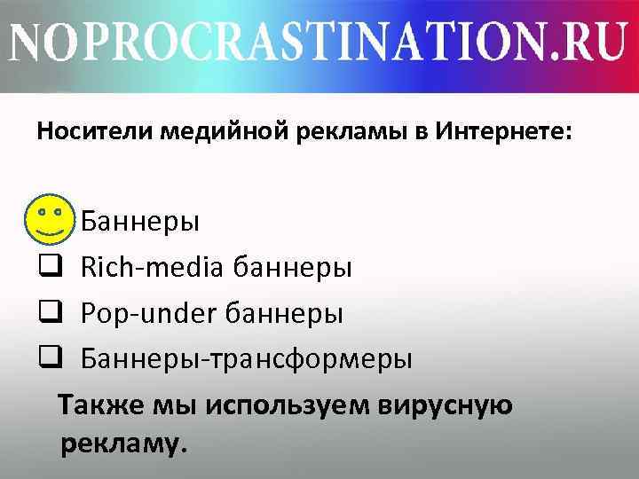 Носители медийной рекламы в Интернете: q Баннеры q Rich-media баннеры q Pop-under баннеры q Баннеры-трансформеры Также мы используем вирусную рекламу.