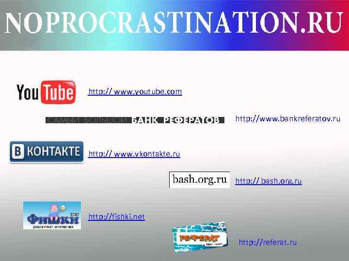 http: // www. youtube. com http: //www. bankreferatov. ru http: // www. vkontakte. ru http: // bash. org. ru http: //fishki. net http: //referat. ru