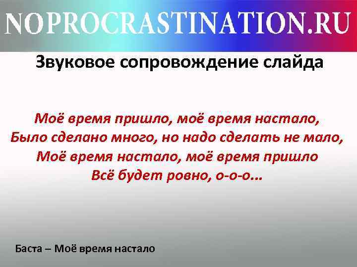 Звуковое сопровождение слайда Моё время пришло, моё время настало, Было сделано много, но надо сделать не мало, Моё время настало, моё время пришло Всё будет ровно, о-о-о. . . Баста – Моё время настало