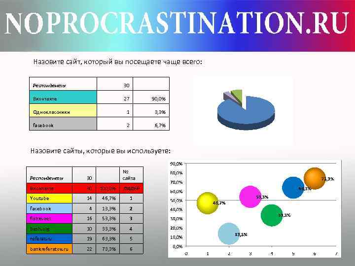Назовите сайт, который вы посещаете чаще всего: Респонденты 30 Вконтакте 27 90, 0% Одноклассники 1 3, 3% facebook 2 6, 7% Назовите сайты, которые вы используете: Респонденты 30 № сайта Вконтакте 30 100, 0% ЛИДЕР Youtube 14 46, 7% 1 facebook 4 13, 3% 2 fishki. net 16 53, 3% 3 bash. org 10 33, 3% 4 referat. ru 19 63, 3% 5 bankreferatov. ru 22 73, 3% 6